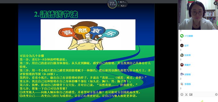 讲座中,刘静老师首先介绍了抑郁症堪称为心理“癌症”,将成为影响人类健康的第二大疾病。但因广大民众对抑郁症的认识不足,使有些人深受其害而不自知,严重影响了身心健康,严重者出现自杀现象。接着刘老师结合实际案例,深入浅出地介绍了抑郁症与焦虑症的表现、危害、诊断依据以及如何有效预防和治疗。同时,在理论阐述中穿插了心理测试、腹式呼吸训练、情绪觉察训练等活动,充分调动了同学们参与的积极性,师生线上互动热切。