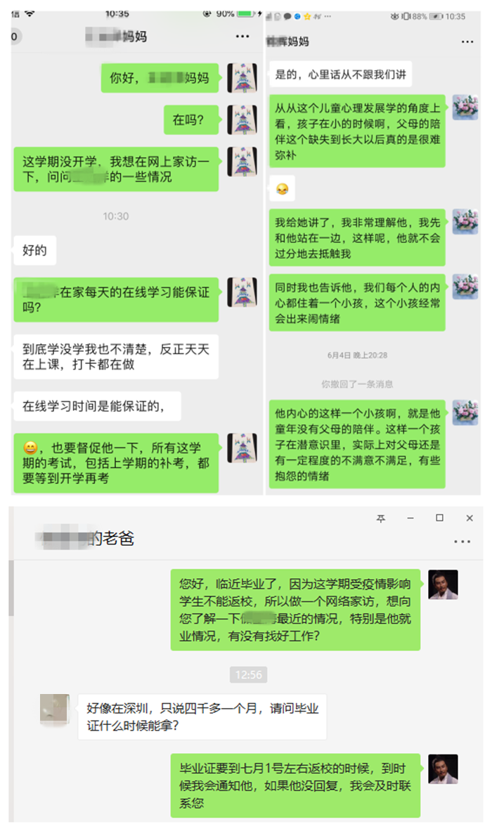 通过云端家访活动,加强了教师与学生的联系,使教师了解学生的家庭状况和成长环境。同时通过线上云端家访,进一步筑牢家校协同抗击疫情、助力学生成长成才的坚强堡垒,不仅及时解决了实际困难和困惑,也加深了家校间的感情,“访”出数统学院爱的温度。