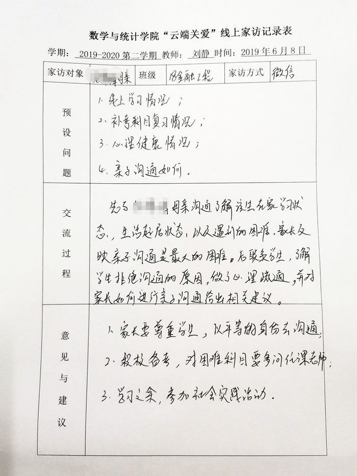 为使家访活动有序开展,数统学院成立“云端关爱”线上家访领导小组,对家访内容及组织实施做了详细的部署。针对学生的思想动态、学习生活、就业情况等方面,及时了解现状及存在的困难,根据造成困难的原因分类指导,并对经济资助、学业帮扶、心理咨询、就业指导等方面精准施策。