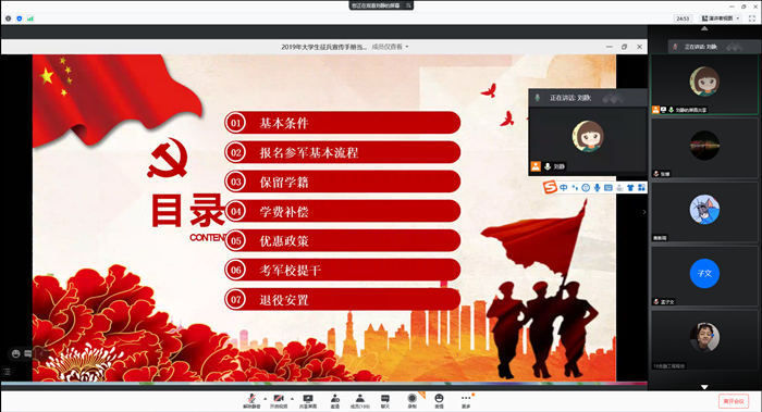 为加强2021年春季征兵宣传工作,1月4日晚8时,数学与统计学院举行2021年春季征兵宣讲会。因考虑毕业班同学在校外实习,本次宣讲会采用线上宣讲的形式。团总支书记刘静担任本次宣讲的主讲人,学院各年级学生参加了此次会议。