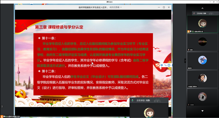本次宣讲会共分为三个环节,刘静老师首先从成长成才的角度对征兵的基本条件、报名参军的流程、就学、就业、经济补助等方面政策进行了详细得解释说明,随后又重点向学生们介绍了《宿州学院鼓励大学生应征入伍学籍管理办法》的相关条例,最后针对学生提出的“课程修读与学分认定”、“毕业及学位授予”等相关问题进行了解答。