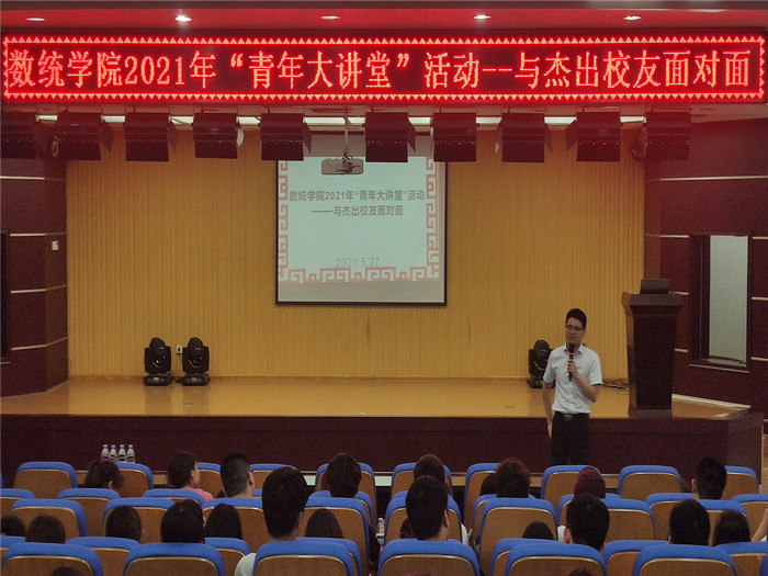 5月27日下午2:30,数统学院在招聘大厅举行了“青年大讲堂”活动,在校学生与青年杰出校友面对面交流。本次青年大讲堂活动主要由优秀毕业生戎放龙给同学们进行经验交流与分享。