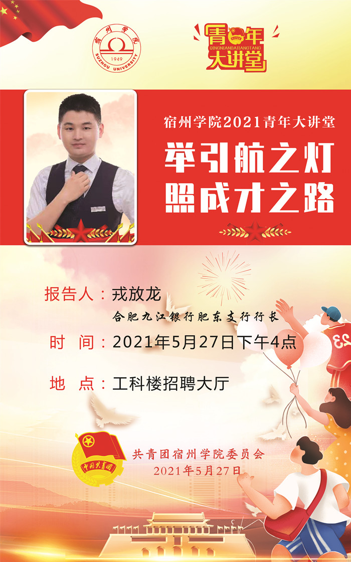 戎放龙是现任合肥九江银行肥东支行行长,作为一名宿州学院数学与统计学院的优秀毕业生,戎放龙为同学们介绍了入职九江银行的个人职场经历、学习晋升支行行长的过程、个人努力奋斗的重要性以及现如今的大学毕业生就业形势的严峻性,现场与同学们友好互动并鼓励同学们努力学习,保持奋斗的恒心与毅力,以更好地姿态迎接人生的挑战。最后由团总支书记刘静进行经验交流总结与同学们一起分享,告诫大家要保持勤奋,脚踏实地。