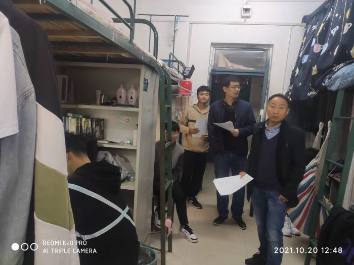 为加强学生宿舍安全教育,规范学生住宿行为,提高学生的安全意识。2021年10月21日中午12:30,数统学院党委副书记陈攀峰(临时负责)、党委副书记徐依俭带领科级干部与全体辅导员深入各宿舍进行了安全隐患排查。学生会权益维护中心的同学进行了协助。