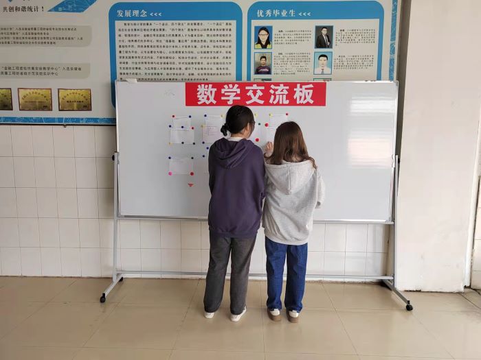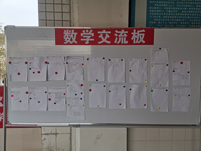 活动自3月14日启动以来,放置于教学楼二楼走廊里的“数学交流板”吸引了数统师生的围观,同学们将自己遇到的难题贴到交流板上,由主办方学科部将题拍下来发送至学习交流群中,同学相互解答。主办方将正确的答案贴于黑板上,由答题的正确率和速度进行评奖。对于同学们没有解答出来的题目,主办方请教了专业老师后进行及时公布。“数学交流板”展示着师生智慧的结晶,散发着数学文化的魅力。