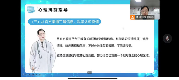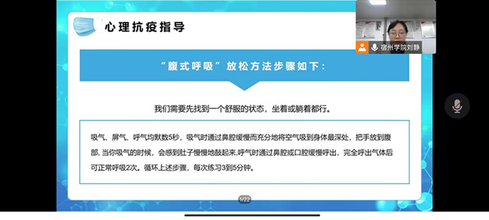 此次讲座会采用PPT讲解,视频穿插分析,以及师生互动的方式进行。刘静首先从“调整心态,做自己情绪的主人”“及时求助,获取心理支持”“从官方渠道获取信息,科学认识疫情”“自律自控,保持健康生活方式”四个方面给出心理抗疫指导,接着传授“腹式呼吸方式”和“肌肉方式”等放松训练的技巧和步骤,并开展线上练习。最后,带领学生对日常防疫知识再熟读。同学们表示本次讲座虽然线上进行,但内容丰富,习得了心理健康调适方法,感受到了老师传递的温暖和力量。