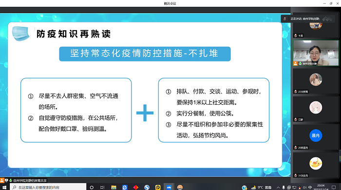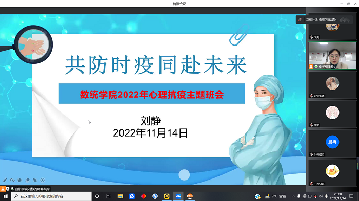 为了缓解大学生在疫情封控下紧张、焦虑状态,更好促进大学生的健康成长,数学与统计学院分团委书记、心理辅导员刘静组织21、22级学生于11月14日晚上举行了“共防时疫同赴未来”为主题的线上心理抗疫讲座。