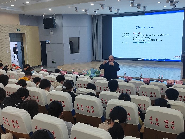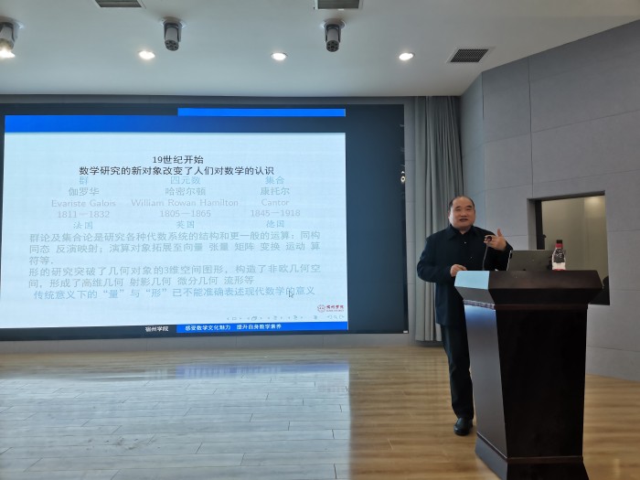 开幕式在数统学院学子们悦耳的歌声中拉开了帷幕。首先,校团委书记凌峰为此届“数学文化月”发表致辞,详细介绍了第二届数学文化月的活动设计,指出“数学文化月”旨在弘扬数学文化、展示数学魅力、提升学生综合素质,助力推动构建五育并举的工作目标体系,并针对活动宣传、活动组织、活动成果的展示提出了三点希望。接着宁群教授以“感受数学文化魅力,提升自身数学素养”为主题,做了一场精彩的报告。先是以历史上著名数学家发现和创作的数学公式为切入点,再从数学是“文化”、是“智慧”、是“语言”、是“艺术”、是“猜想”五个方面介绍了数学文化的魅力。宁群教授一方面以慷慨激昂的语言表达着对数学家的崇敬,一方面用生动有趣的故事引导同学们去理解数学思维,深深吸引着在场的每一位师生。报告后,同学们与宁教授关于如何更好地继承与发扬数学文化进行了充分的交流。