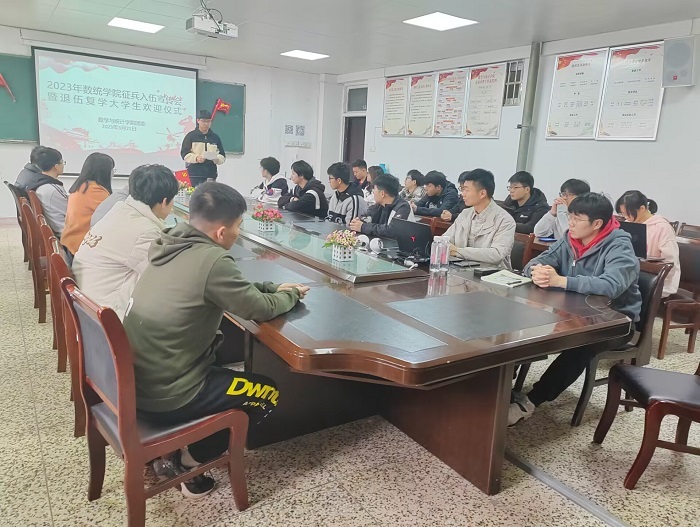 为深入宣传国家征兵政策,扎实推进大学生征兵工作,数学与统计学院团委于3月21日中午12:40在东教学楼二楼会议室举办了征兵入伍宣讲活动暨退伍复学大学生欢迎仪式。本次活动由22应数团支部承办,数统学院党委副书记徐依俭、团委书记刘静、退伍复学大学生景博以及各班级有入伍意愿的同学参加了活动。