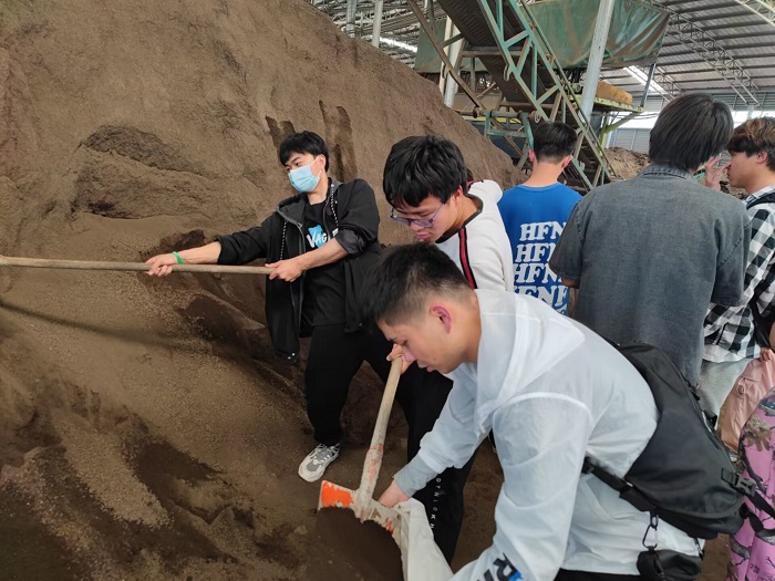 参观完毕,同学们来到了有机肥生产车间,进行有机肥装袋劳动。天气虽然炎热,但是同学们热情高涨,自动分组,迫不及待地拿上工具,在工作人员的指导下,把有机肥料装配到相应的袋子里,并进行过秤。大家协作劳动,互相帮助,克服困难,动作逐渐娴熟。经过一个小时的劳动,同学们汗流浃背,但看着劳动成果,心情格外愉悦。