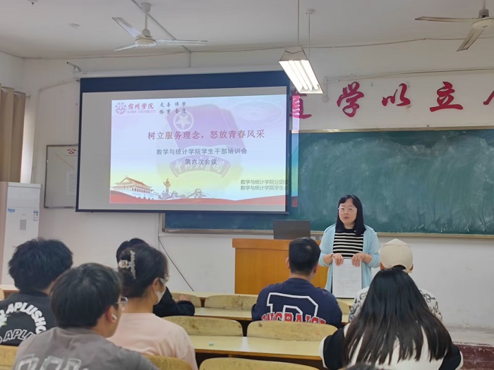 为深入推进学习贯彻习近平新时代中国特色社会主义思想主题教育,引领青年学生在社会课堂中受教育、长才干、做贡献,充分发挥实践育人作用,数学与统计学院于6月2日下午4:20在教学楼A103召开以“树立服务理念,怒放青春风采”为主题的学生干部培训会,本次会议由数学与统计学院执行主席石韦权主持,团委书记刘静作为培训主讲人。