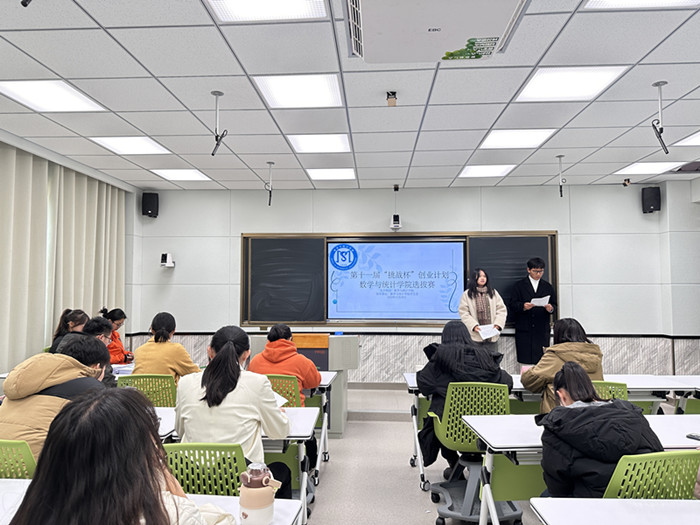 为深入学习贯彻习近平新时代中国特色社会主义思想,贯彻落实国家双创工作部署,提高创新创业的意识和能力,数学与统计学院团委于11月29日中午12点30分在教学楼A201教室举办第十一届“挑战杯”安徽省创业计划竞赛学院选拔赛。本次比赛邀请音乐学院莫梦娴、环境与土木工程学院杨文、文学与传媒学院李雪玲三位老师做评委。
