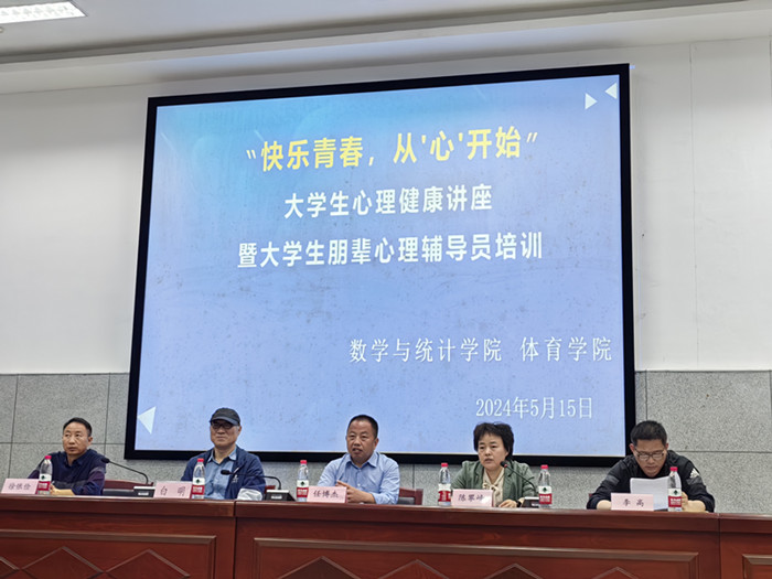 为提升大学生心理健康意识,加强心理辅导员培训,营造积极向上的校园心理氛围,数学与统计学院、体育学院于5月15日在体育学院报告厅举办“快乐青春,从心开始”心理健康讲座暨朋辈心理辅导员培训活动。数学与统计学院党委书记陈攀峰、体育学院党委书记李高、体育学院院长白明、数学与统计学院副书记徐依俭以及“心灵艺彩”辅导员工作室成员刘静、田慧丽出席,两个学院的班级心理委员、宿舍心理信息员等朋辈心理辅导员参加培训。