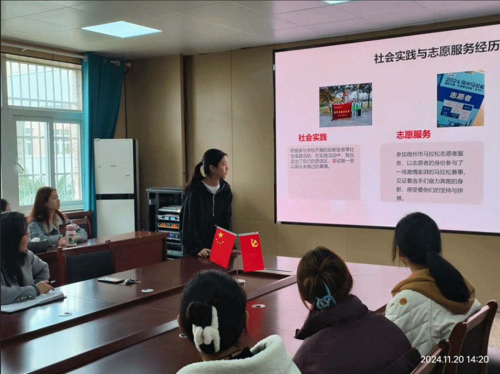会上,“宿州学院十佳大学生”申请人居苒和王静慧依次从思想品德、学习、科研、社会实践、个人规划等几个方面阐述在校期间成长经历和取得的收获。在场师生对相关问题提问并做出回答。