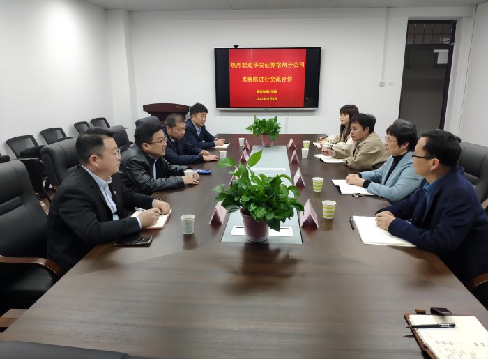 2022年11月9日,华安证券宿州分公司总经理吴剑等一行4人到数学与统计学院进行工作交流,数学与统计学院副院长(临时负责)徐秀荣、党委副书记(临时负责)陈攀峰、教学副院长李耀红、科研副院长武以敏等参加交流,并对他们的到来表示热烈欢迎。双方就加强校企合作交流,学生实习实训就业工作、人才培养等工作进行了交流。