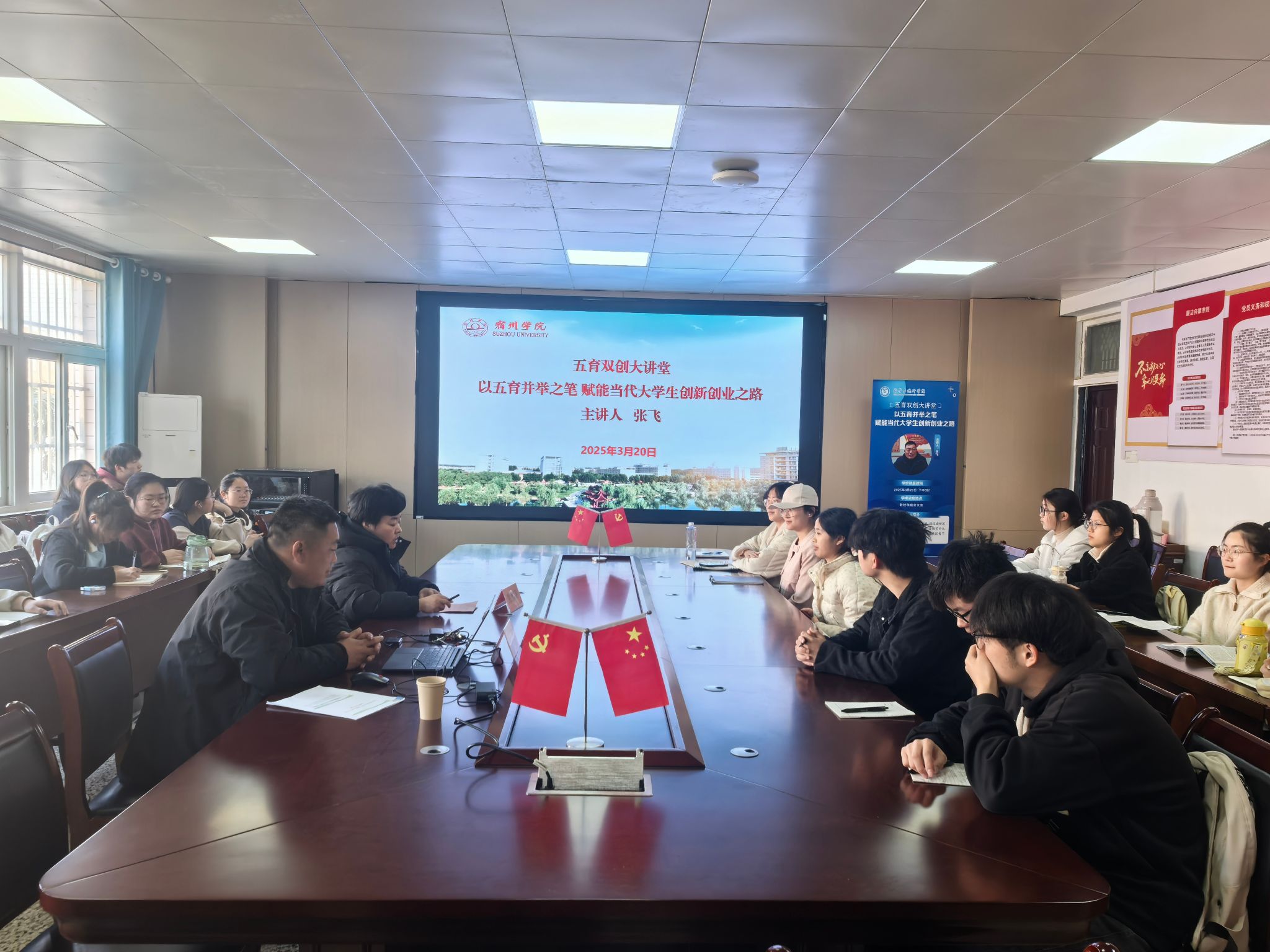 为着力培养德智体美劳全面发展的创新型素质人才,2025年3月20日下午在数统学院会议室举办了五育双创大讲堂活动。本次活动邀请了埇桥区支河镇赵楼中学党支部书记、校长张飞作题为《以五育并举之笔,赋能当代大学生创新创业之路》的讲座。此次活动由数学与统计学院党委书记陈攀峰主持,数统学院辅导员周樊和部分学生参加。