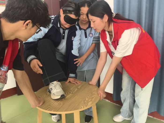 除了志愿者精心准备的四节课程外,还另外开展了“盲人拄拐”深度心理体验活动。活动设置多个关卡,在志愿团队的协助下,同学之间相互配合,克服心理恐惧,体会到了信任的力量。