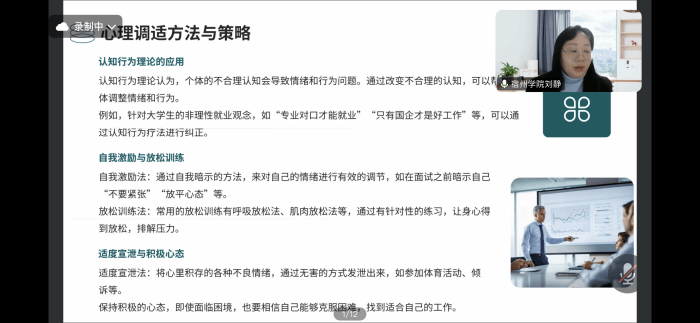 辅导员刘静聚焦就业心理调适,为同学们剖析了就业市场现状与竞争态势。面对当前就业市场供需失衡,热门行业竞争激烈,毕业生的就业期望与现实之间存在较大差距等挑战,毕业生容易出现焦虑、攀比、自卑等心理偏差。刘静结合实际案例,分享了多种心理调适方法,如认知行为疗法、自我激励与放松训练、适度宣泄等,鼓励同学们保持积极心态,树立适应性就业观,灵活调整就业方向。