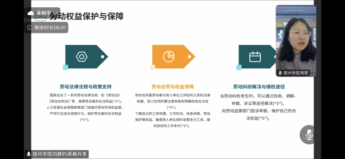 辅导员周樊则着重讲解了就业安全的重要性。她结合真实案例,强调在求职过程中要警惕虚假招聘信息、黑中介、诈骗等问题,避免个人信息泄露和财产损失。提醒毕业生应选择正规的招聘渠道,了解劳动法律法规,签订合法有效的劳动合同,维护自身合法权益。