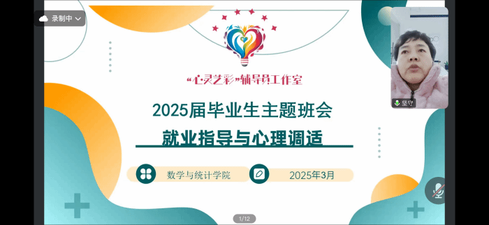 2025年3月11日19:30至21:00,“心灵艺彩”辅导员工作室举办“职海领航,心适远航”毕业生就业指导与心理调适线上培训会,旨在帮助2025届毕业生更好地应对就业挑战,调整心态,顺利开启职业生涯。本期培训会的培训对象是数学与应用数学和金融工程专业的毕业生,培训会邀请了数学与统计学院党委书记陈攀峰和副书记徐依俭以及辅导员参会。