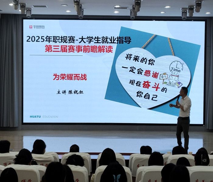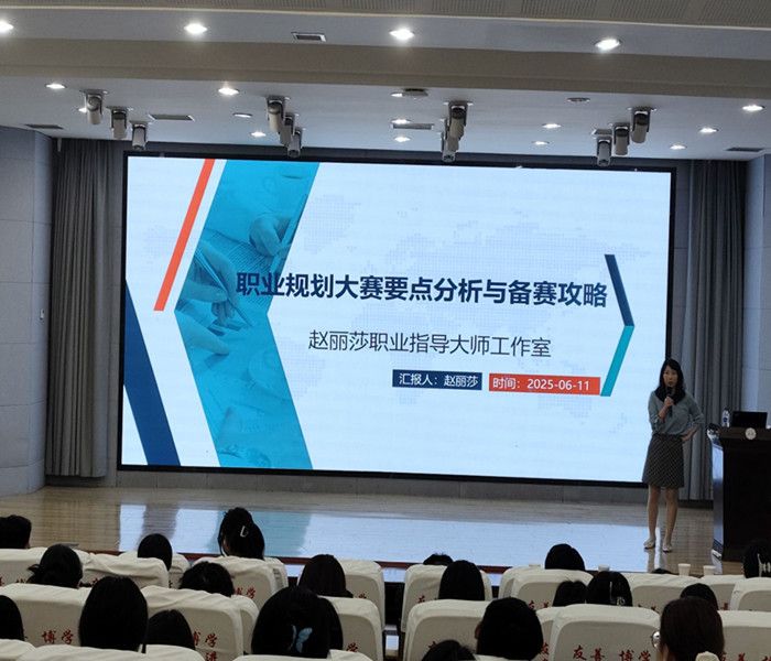 安徽华图教育师资教研主任陈祝红、宿州市职业指导大师工作室项目负责人赵丽莎,作为主讲嘉宾,围绕大赛要点,结合具体案例向同学们讲解了备赛技巧与策略。陈祝红做了题为《职业规划大赛-大学生就业指导》的讲座,从“职规赛”赛事解码,赛事与往年的差异,基本流程与评价标准三方面展开讲解,详细介绍了参赛过程中需要注意的关键事项,就如何准备相关材料、提高竞争力等方面给出了专业建议。赵丽莎做了题为《职业规划大赛要点分析与备赛攻略》的讲座,从为何“赛”、“赛”什么、如何“赛”三方面,围绕大赛要点,结合具体案例向同学们讲解了备赛技巧与策略。