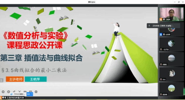 王艳萍老师讲的是《数值分析与实验》第三章第五节曲线拟合的最小二乘法。以“新冠疫苗”的视频为引入,简单介绍其背景,由疫苗接种时间间隔问题引入血药浓度规律探索,引出课程内容,讲中国故事,传播中国声音,不仅体现出科研人员勇于探索、求真务实的高贵品质和科学精神,也让学生明白防控疫情是每一个公民的责任和义务,充分认识到自身的健康、生命安全与国家命运和疫情息息相关的,激发学生爱国、爱党情怀。