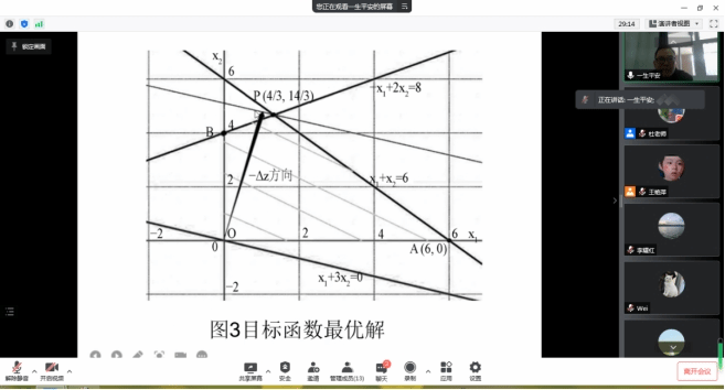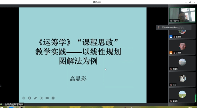 高显彩老师讲的是《运筹学》,以线性规划图解法为例进行课程思政融入,结合图解法归纳了所应用的数学思想:数形结合、归零为整、化静为动。并在讲解步骤时插入思政元素:做任何事情都要遵守规则;透过现象看本质,抓住事物的共性也就是本质才能升华和收获;量的积累引起质变等内容。