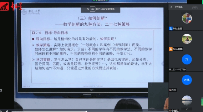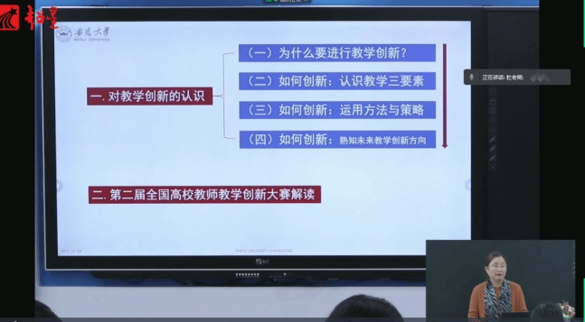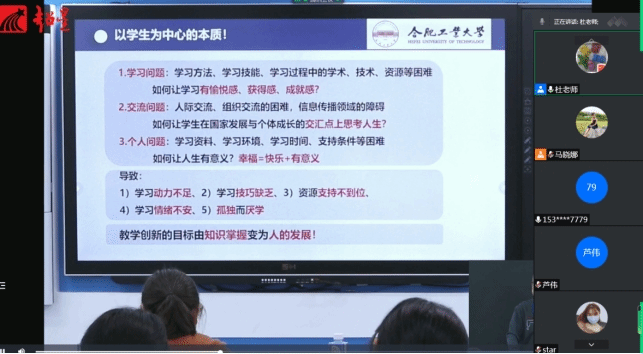 4月7日下午,数学与应用数学教研室在线上开展了教学创新教研活动。为进一步提升青年教师课程教学创新能力,提高课堂教学质量,教研室以安徽省第二届全国高校教师教学创新大赛教学创新研讨会为依托,集中学习了合肥工业大学于宝证老师与安徽大学张洪老师在研讨会上的报告视频,教研室全体教师参加了活动,活动由教研室主任杜玉霞主持。