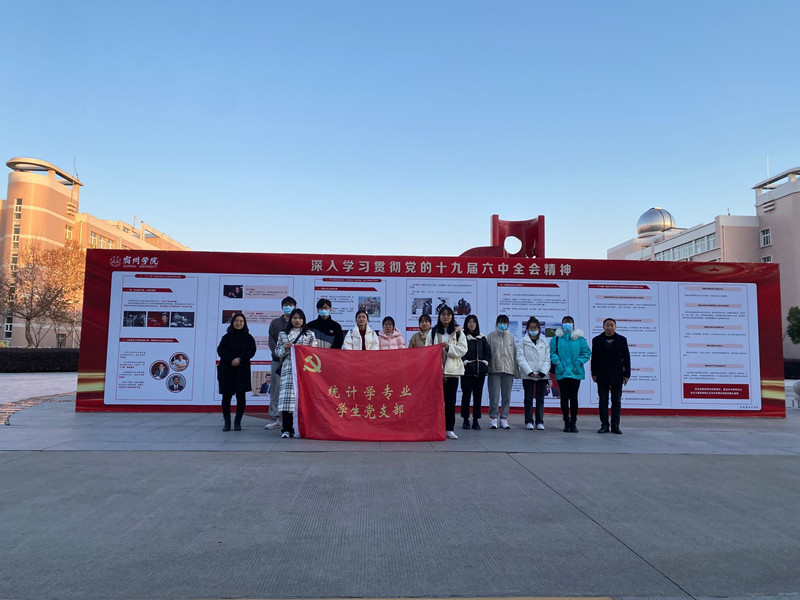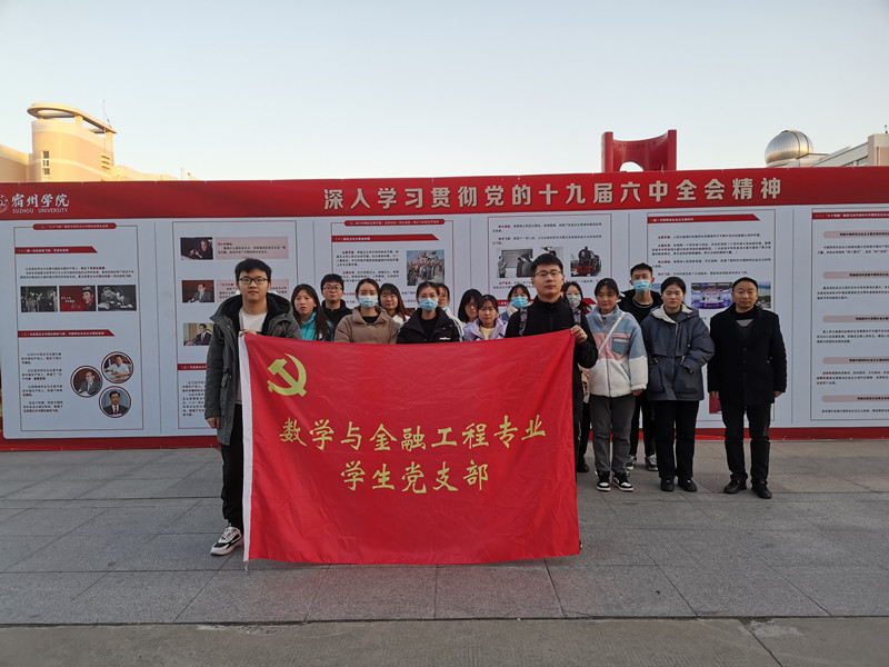 为促进党的十九届六中全会精神进学校,引导广大师生深入学习党的百年奋斗重大成就和历史经验,近日,“深入学习贯彻党的十九届六中全会精神”学习展览在图书馆前广场展出。12月1日下午,数学与统计学院党委副书记徐依俭带领统计学专业学生党支部、数学与金融工程专业学生党支部的师生到展览现场参观。