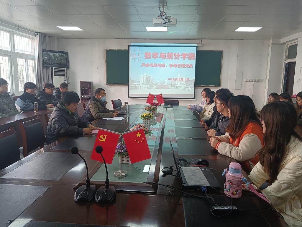为加强学风和考风建设,发挥学生党员的带头作用,以党建促学风,12月14日下午,数学与统计学院在教学楼会议室召开了“严肃考风考纪,争做合格党员”主题大会。数统学院党委副书记徐依俭、组织员梁武及2019级全体预备党员参加会议,会议由数统学院党委副书记陈攀峰(临时负责)主持。