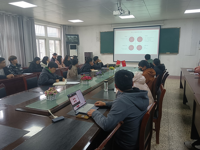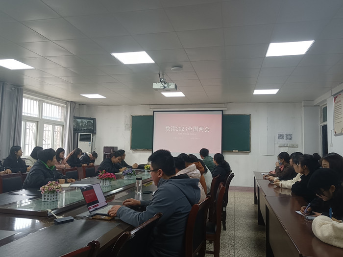 为深入学习贯彻习近平总书记在全国两会期间的重要讲话和全国两会精神,切实把思想和行动统一到习近平总书记重要讲话精神和党中央决策部署上来,2023年3月22日下午,数学与统计学院在会议室召开两会学习报告会。会议由党委书记陈攀峰主持,专职组织员梁武、统计与金融教研室教师党支部全体党员以及部分学生代表参加,党支部书记李壮壮博士做了题为“数读2023全国两会”的专题报告。