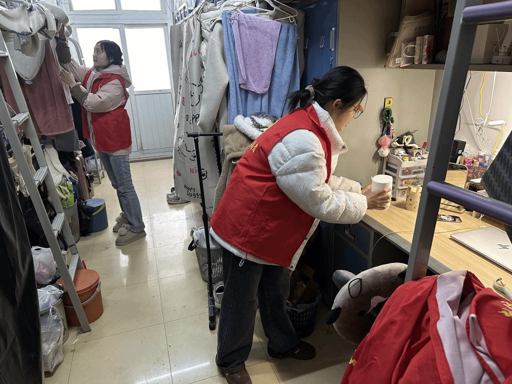 活动中,入党积极分子满怀热情地走进一间间宿舍,手把手帮助学生整改宿舍中存在的内务整理、安全用电、杂物乱放等问题,督促各位同学做好榜样和示范,自觉做好宿舍安全卫生工作。冬日寒意来袭,提醒同学们注意保暖,及时增添衣物,预防冬季疾病。同时他们还化身“ 引路人”,鼓励同学们在大学期间勤奋钻研专业知识,积极投身社会实践与志愿服务活动,不断锤炼自身综合素质,以实际行动向党组织靠拢。活动最后同学们前往学生党员宿舍参观、学习,纷纷表示要向学生党员学习,以他们为榜样,用实际行动塑造安全、和谐的公寓文化环境。