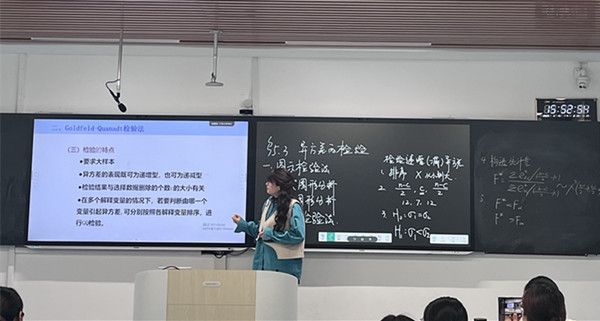 武以敏以扎实的理论功底和丰富的教学经验,为师生呈现了一堂生动而富有深度的示范课。她从异方差的概念、产生原因、后果到检验方法,层层递进,结合经济实例和Eviews软件操作演示,将抽象的理论知识转化为直观易懂的教学内容。课堂上,武以敏准确融入课程思政元素,通过提问互动、案例分析等形式,充分调动学生积极性,体现了“以学生为中心”的教学理念。